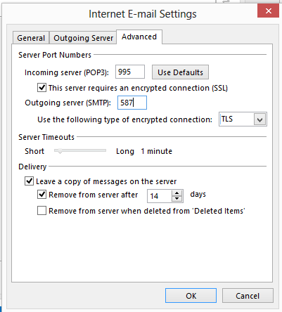 Then, change Outgoing server (SMTP): to 587 if value of Use the following type of encryption connection: is TLS.